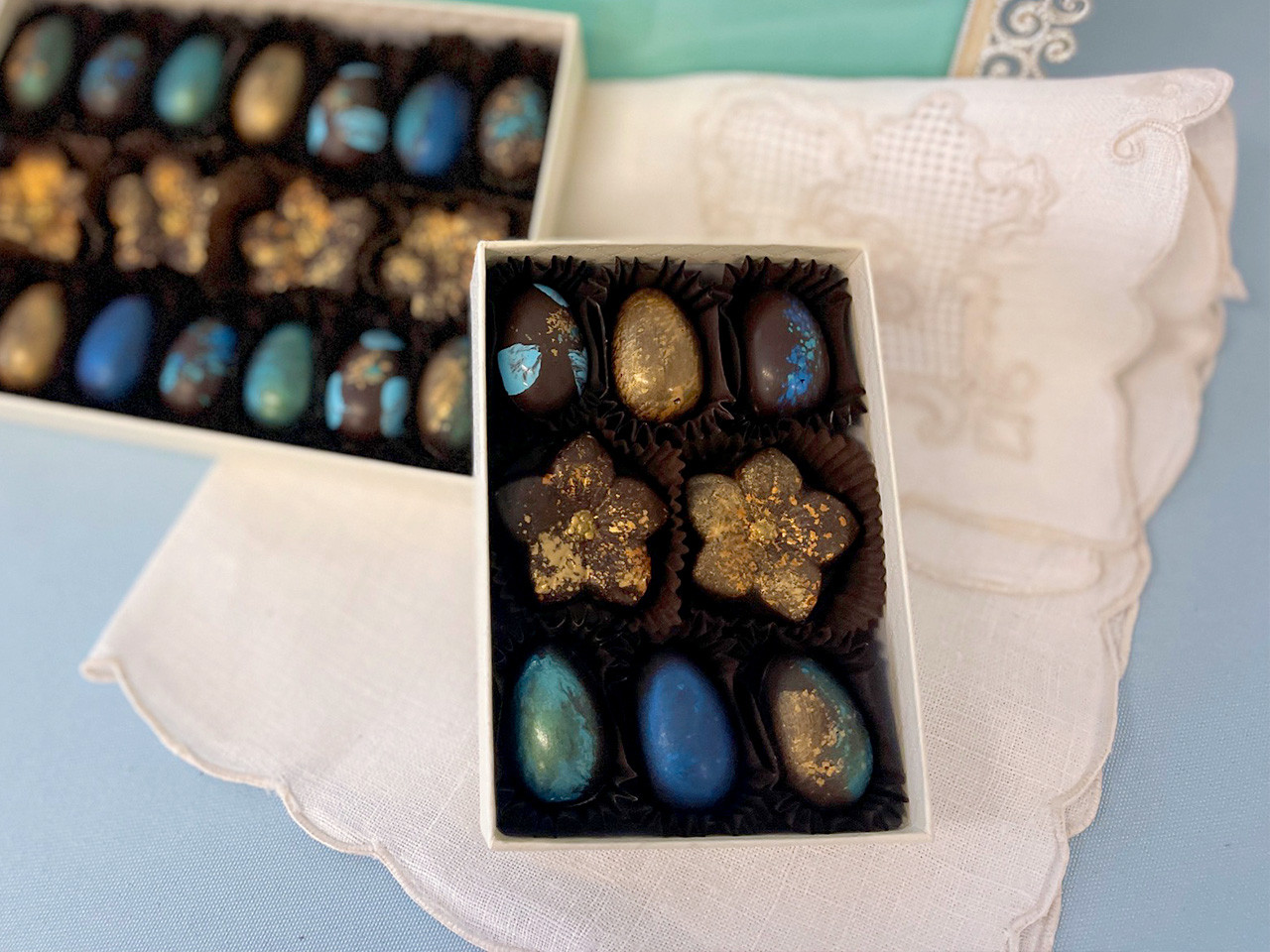 Eggseptionally elegant Eggs and Salted Caramels. 6 Robin's Eggs as pretty and delicious as they come, and 2 Giant Tiger Lilies filled with sublime salted caramels...this is springtime at its best and an Easter delight!